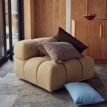 Med Milo arbejdede jeg bevidst med et mere markant, bokset formsprog. De høje armlæn og de dybe sæder giver sofaen en arkitektonisk tyngde, samtidig med at komforten omslutter en